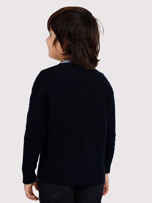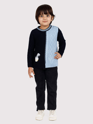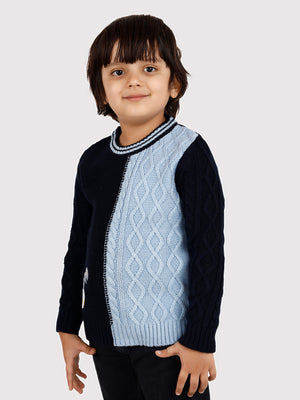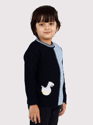 Let your child step out in style and comfort with this uniquely designed dual-tone sweater. Featuring a trendy split-color design in navy blue and sky blue, this cozy knit sweater stands out with its classic cable knit pattern and fun embroidered dinosaur patch at the hem. The round neckline with a contrast trim adds an extra touch of charm to this winter essential.