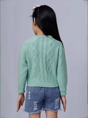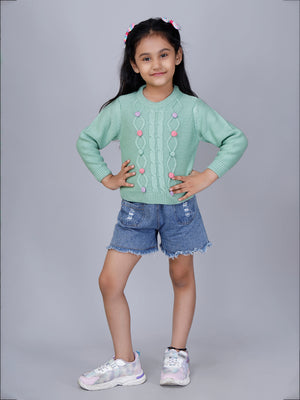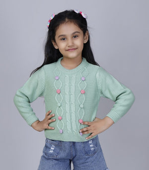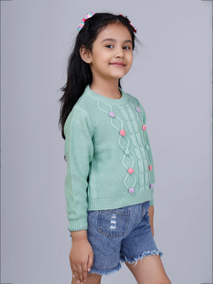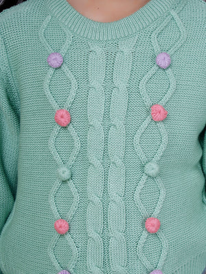 Keep your little one stylish and cozy with this adorable mint green knitted sweater. Designed with both comfort and charm in mind, this sweater features a soft, warm knit fabric perfect for cooler weather. The front showcases a beautiful cable-knit pattern accented with colorful pom-pom embellishments in pink, purple, and green, adding a playful touch.