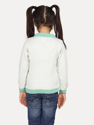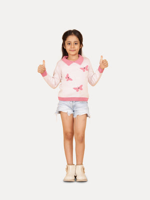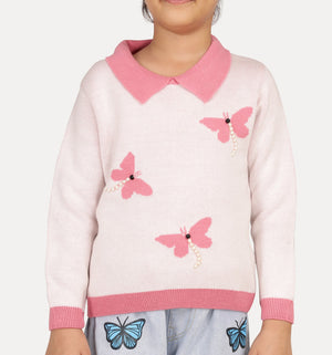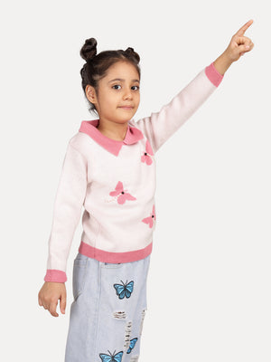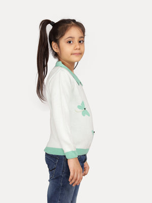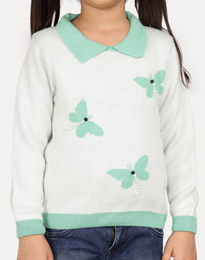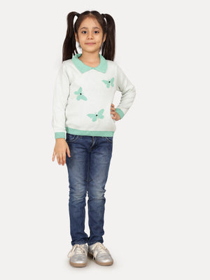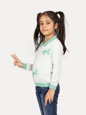 Delight your little one with this charming off-white pullover featuring delicate butterflies adorned with pearl accents. The pullover is designed with contrasting green cuffs and collar, adding a fresh and playful touch to its elegant look. The intricate butterfly embroidery brings a whimsical element, while the pearls provide a touch of luxury. Crafted from soft, high-quality fabric, this sweater offers warmth and style, making it perfect for special occasions or casual wear. Pair it with skirts, leggings, or jeans for a complete outfit that’s as cute as it is cozy.