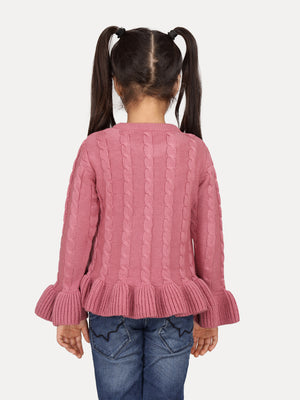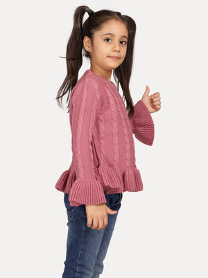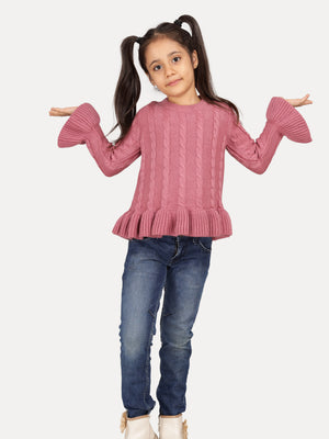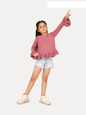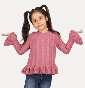 Give your little one a touch of elegance and warmth with this charming plum cable knit pullover. Featuring delicate knitted frills at the cuffs and hem, this sweater adds a whimsical, playful vibe to any outfit. The rich plum color combined with the classic cable knit pattern makes it perfect for chilly days, providing both style and comfort.