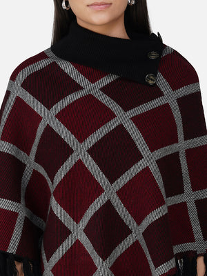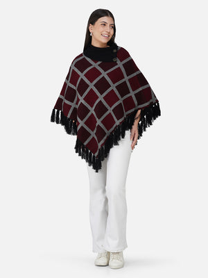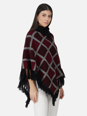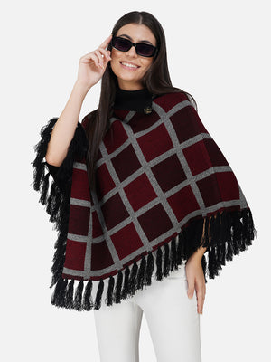 Elevate your style with our stunning Maroon, Black and White Check Poncho, designed to add a touch of sophistication and warmth to any outfit. This versatile poncho features a classic check pattern in rich maroon, crisp black, and clean white hues offering a timeless look that effortlessly complements any wardrobe. Crafted from high-quality soft fabric, this poncho drapes beautifully over your shoulders, providing a cozy and comfortable fit. The fringed hem adds a playful, bohemian touch, making it perfect for layering over your favorite tops or sweaters.
