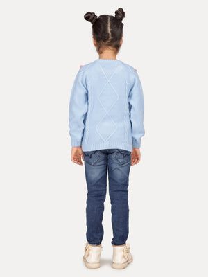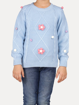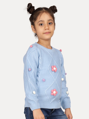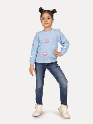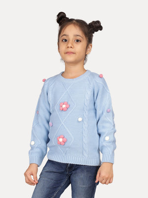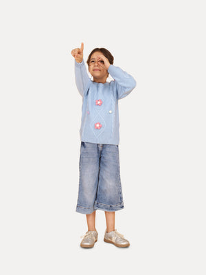 Add a touch of whimsy to your little one's wardrobe with this adorable sky blue cable knit pullover, beautifully embellished with hand-embroidered crochet balls and flowers. The soft, cozy fabric ensures warmth and comfort during chilly days, while the intricate details provide a playful and charming look. Perfect for both casual wear and special occasions, this pullover combines classic cable knit styling with unique handcrafted elements, making it a standout piece in your child's collection.