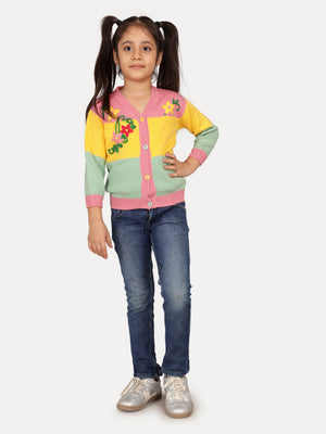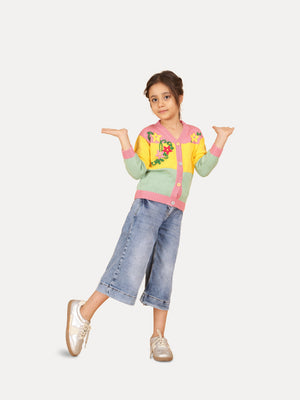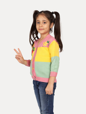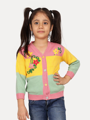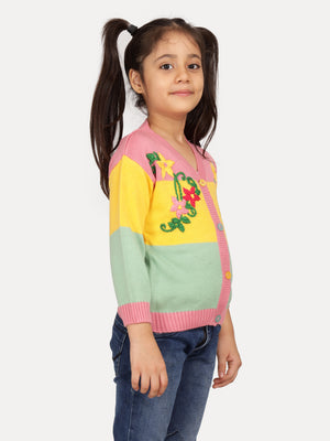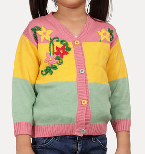 Brighten up your little one's wardrobe with this charming color-block front-closure cardigan. Featuring a delightful mix of pink, yellow, and sage green, this cardigan is both playful and elegant. The hand-embroidered floral pattern adds a unique and delicate touch, making it perfect for special occasions or casual wear.