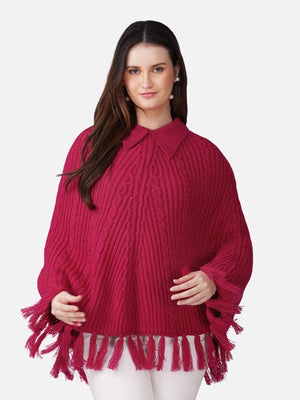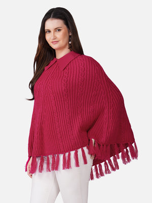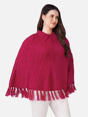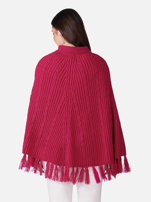 Stay stylish and warm in this chic fuchsia cable knit poncho. Designed with a classic shirt collar for a polished look, it features intricate cable knit patterns throughout for a touch of texture and timeless charm. The relaxed fit drapes beautifully over any outfit, while the fringed hem and sleeve edges add playful movement and a cozy finish. Perfect for layering on breezy days or adding a vibrant pop of color to your winter wardrobe.
