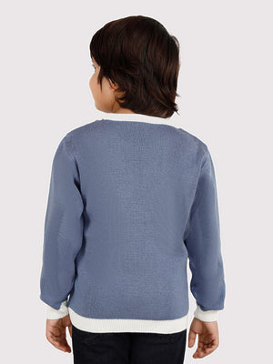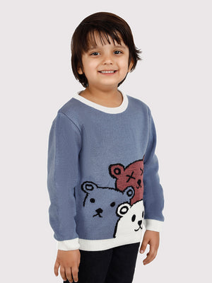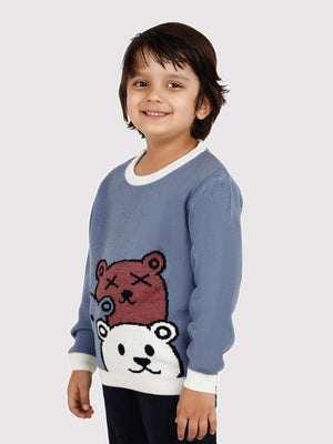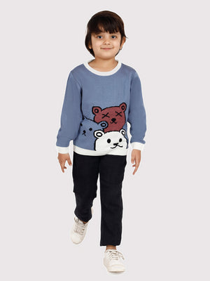 Bring playful charm to your child's winter wardrobe with this adorable blue cartoon bear sweater. Featuring a trio of cute bear faces in white, blue, and maroon, this sweater is sure to be a favorite among kids. Made from soft and cozy knit fabric, it offers warmth without sacrificing comfort. The white ribbed neckline, cuffs, and hem add a clean, stylish finish to the overall look.