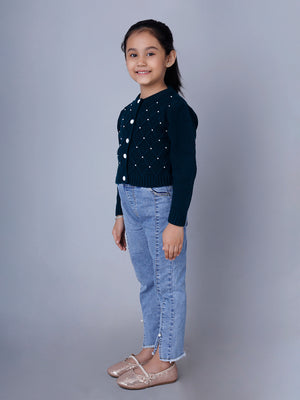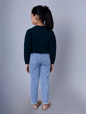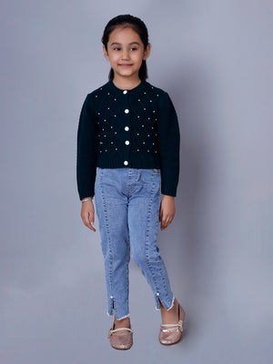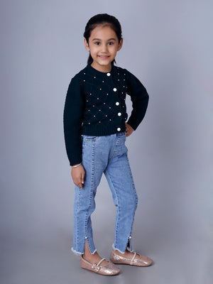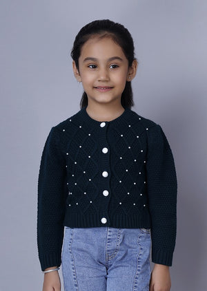 Dress your little one in cozy style with this charming navy knitted cardigan. Made from soft, breathable fabric, it ensures warmth and comfort all day long. The sweater features an elegant diamond knit pattern adorned with delicate pearl accents, giving it a stylish and classy appeal. The front is detailed with white buttons for easy wear, while the ribbed hem and cuffs provide a snug fit.