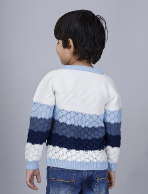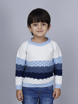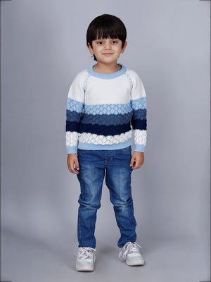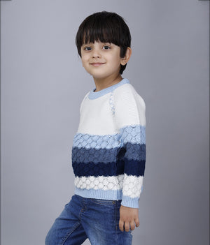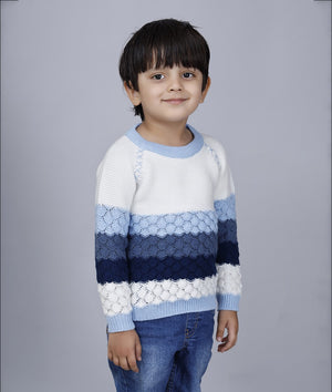 Add a splash of color and comfort to your child’s wardrobe with this stylish multicolor striped sweater. Crafted from soft, warm knit fabric, this sweater features wide horizontal stripes in burnt blue, and white. The textured diamond knit pattern throughout adds a subtle yet sophisticated touch, making it perfect for both casual and slightly dressier occasions.