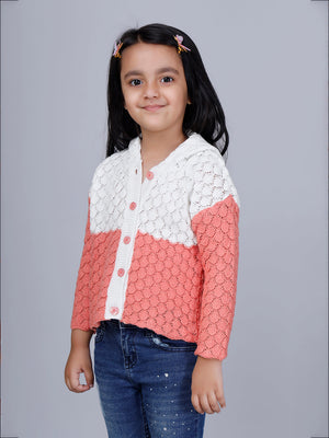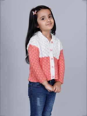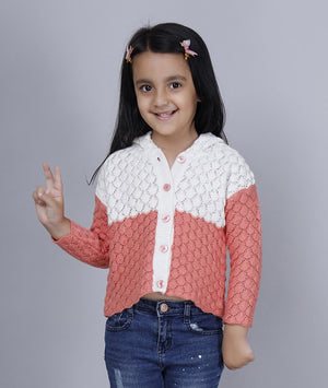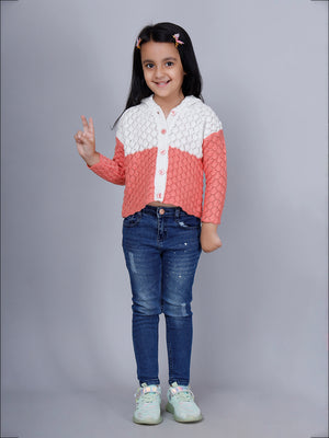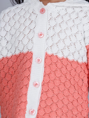 Keep your little one cozy and stylish with this adorable peach & white knitted cardigan. Designed with a charming dual-tone pattern, it blends elegance with everyday comfort. The delicate scallop-knit texture adds a unique touch, while the front button closure ensures easy wear. Made from soft, breathable fabric, this sweater is gentle on the skin and perfect for all-day wear.