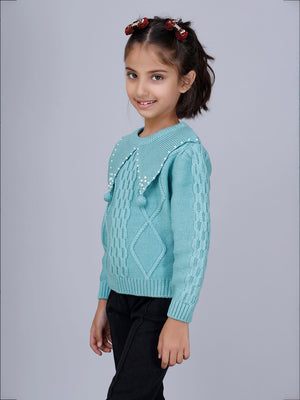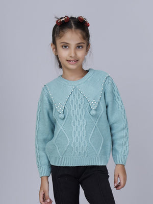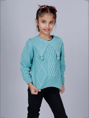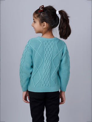 Give your little one a touch of elegance and warmth with this charming cable knit pullover. Featuring delicate knitted frills at the cuffs and hem, this sweater adds a whimsical, playful vibe to any outfit. The rich aqua color combined with the classic cable knit pattern makes it perfect for chilly days, providing both style and comfort.