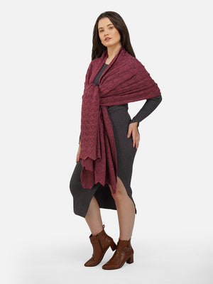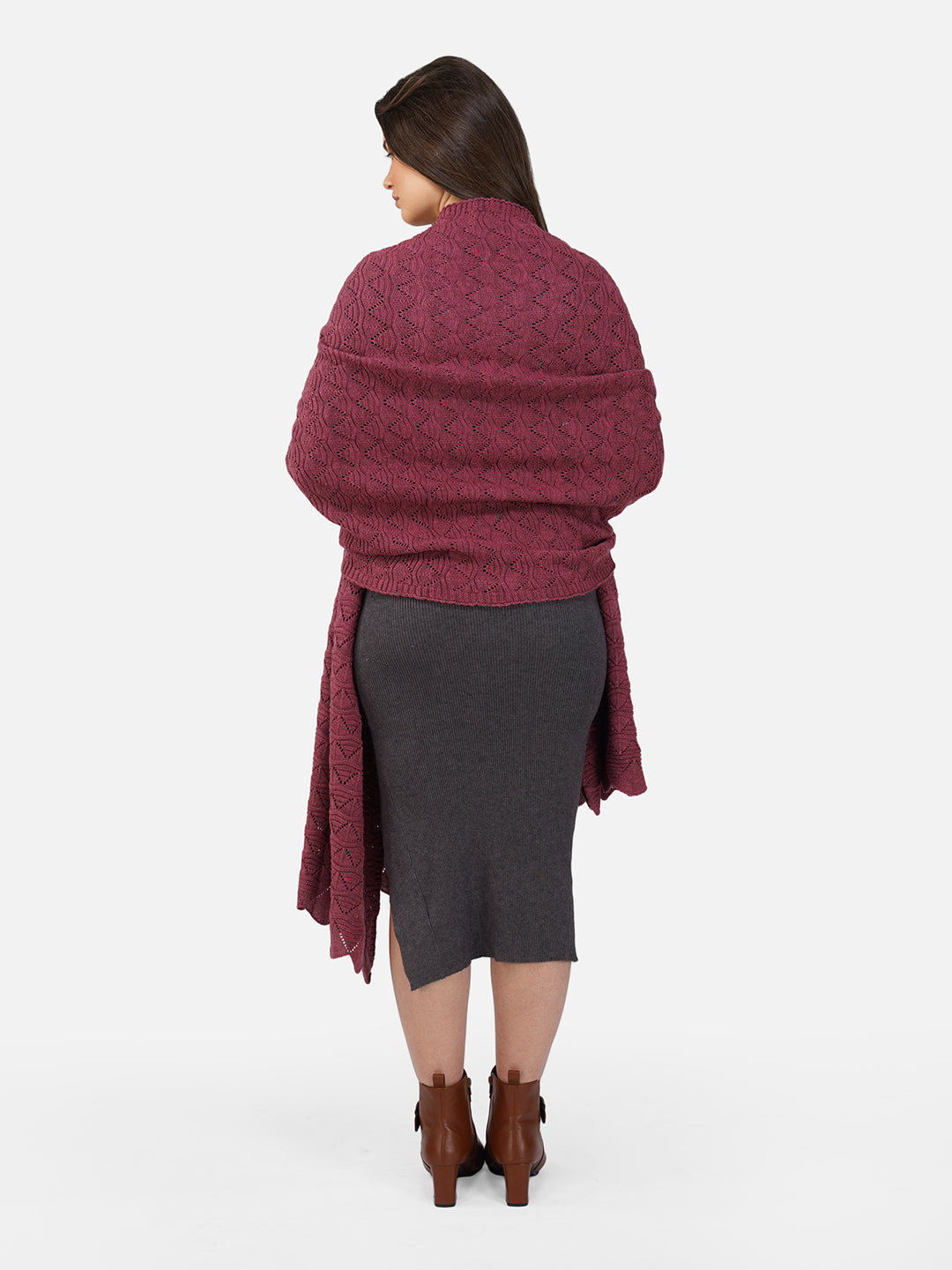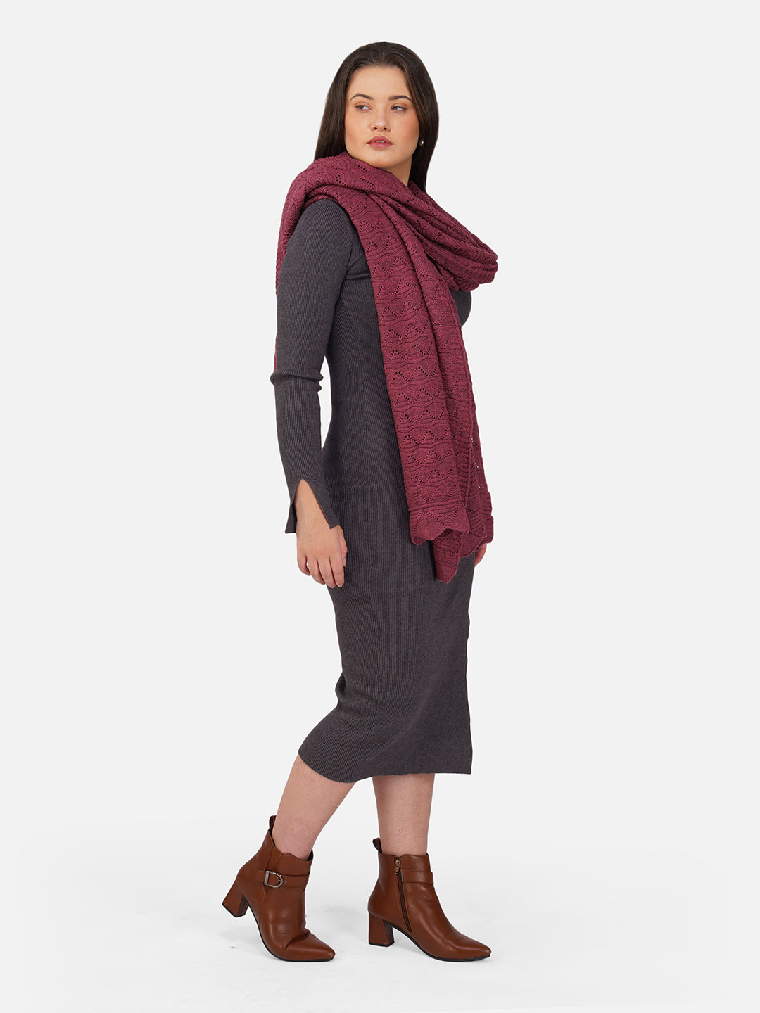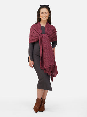 Embrace understated elegance with this Rosewood Pointelle Knit Shawl (32X80 inches), a delicate blend of warmth and style. Featuring an intricate all-over pointelle pattern in a rich plum hue, this shawl adds a sophisticated layer to any ensemble. The scalloped edges and textured knit bring a handcrafted charm, making it a timeless wardrobe staple. Designed for effortless draping, it offers full coverage with a fluid silhouette that’s perfect for both cozy indoors and breezy outdoor strolls. Whether paired with a dress or casual knits, this shawl is your go-to for graceful layering.