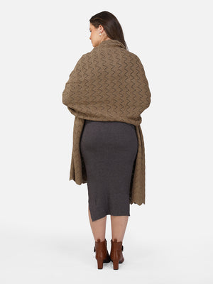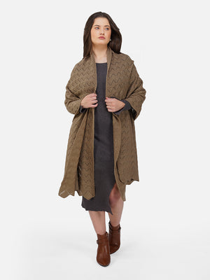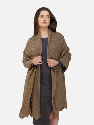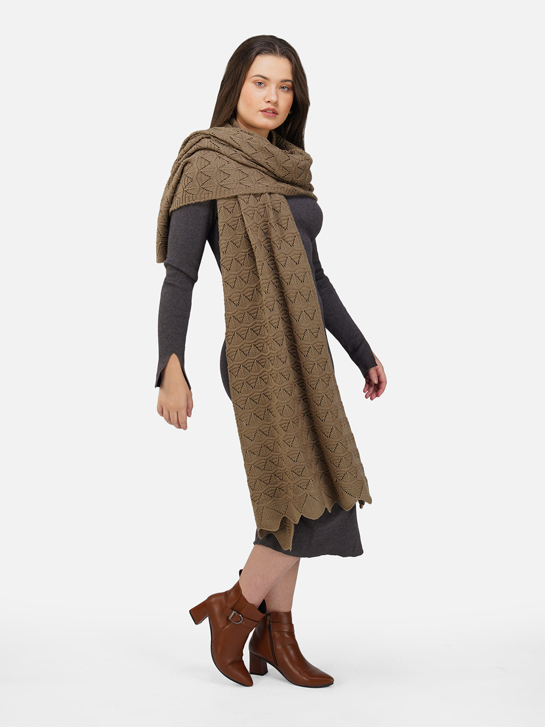 Embrace understated elegance with this Sandalwood Pointelle Knit Shawl, a delicate blend of warmth and style. Featuring an intricate all-over pointelle pattern in a rich beige hue, this shawl adds a sophisticated layer to any ensemble. The scalloped edges and textured knit bring a handcrafted charm, making it a timeless wardrobe staple. Designed for effortless draping, it offers full coverage with a fluid silhouette that’s perfect for both cozy indoors and breezy outdoor strolls. Whether paired with a dress or casual knits, this shawl is your go-to for graceful layering.