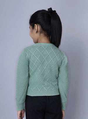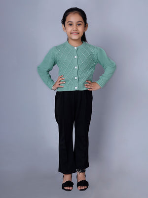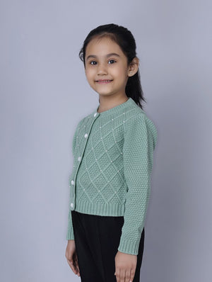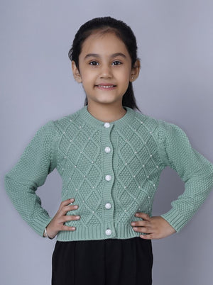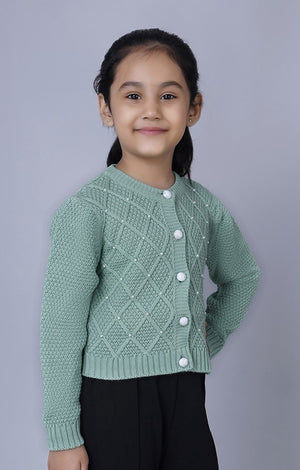 Dress your little one in cozy style with this charming sea green knitted cardigan. Made from soft, breathable fabric, it ensures warmth and comfort all day long. The sweater features an elegant diamond knit pattern adorned with delicate pearl accents, giving it a stylish and classy appeal. The front is detailed with white buttons for easy wear, while the ribbed hem and cuffs provide a snug fit.