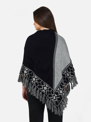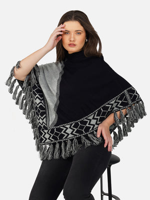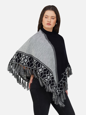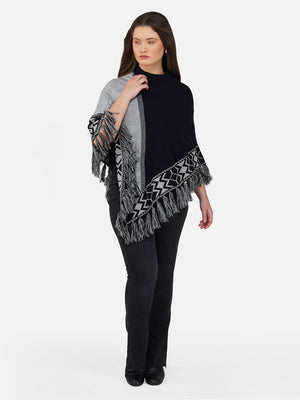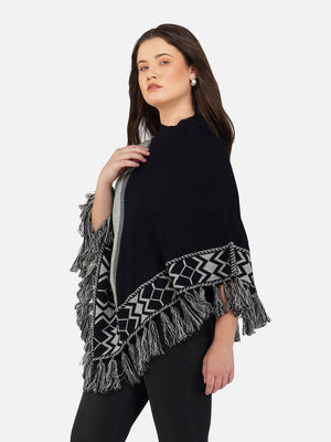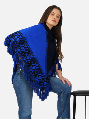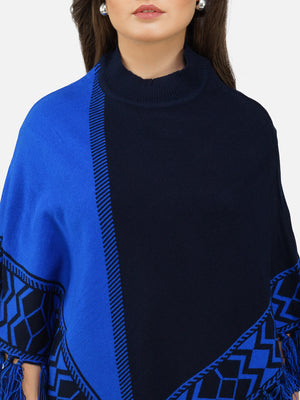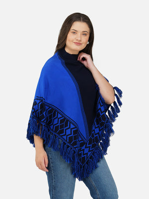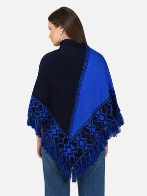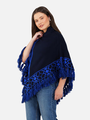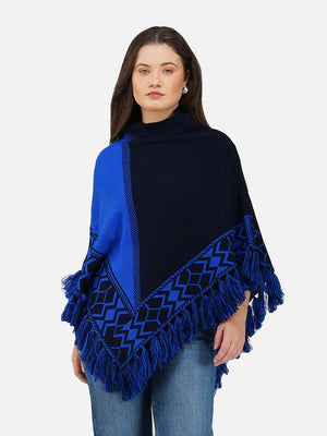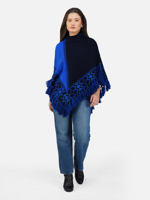 Wrap yourself in cozy elegance with the Nordic Echo Poncho, where comfort meets timeless design. This two-tone poncho features a sophisticated blend of striking royal blue and deep navy, framed by intricate geometric patterns along the border. Delicate fringed edges add playful texture and a hint of bohemian flair. Tailored in a flowy silhouette with a high neckline for extra warmth, it’s the perfect layering piece for crisp days and cool nights. Whether you're heading out for a coffee run or a weekend escape, this poncho brings effortless charm and warmth to any outfit.
