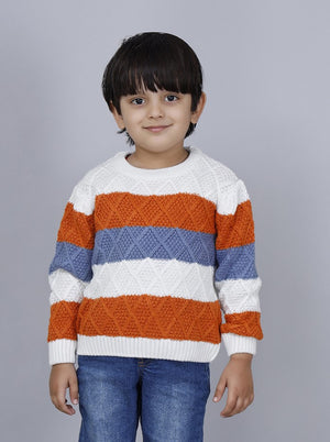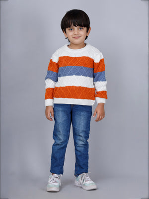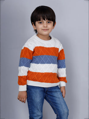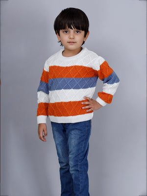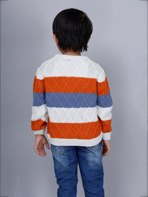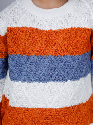 Add a splash of color and comfort to your child’s wardrobe with this stylish multicolor striped sweater. Crafted from soft, warm knit fabric, this sweater features wide horizontal stripes in burnt orange, blue, and white. The textured diamond knit pattern throughout adds a subtle yet sophisticated touch, making it perfect for both casual and slightly dressier occasions.