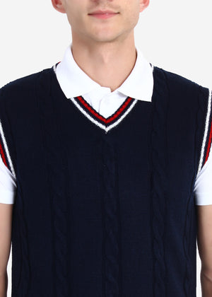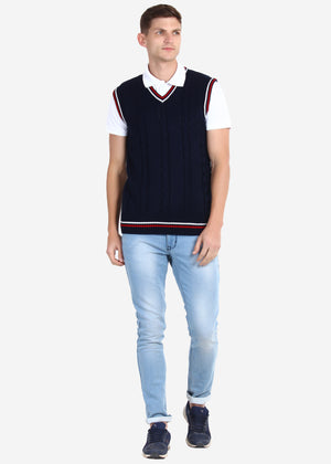 Navy blue self design sweater vest, has a V-neck, sleeveless, ribbed hem. Materials Care Normal Cycle upto 30'C Do not Bleach Do not Iron. Do not Dry Clean. Do not Tumble...