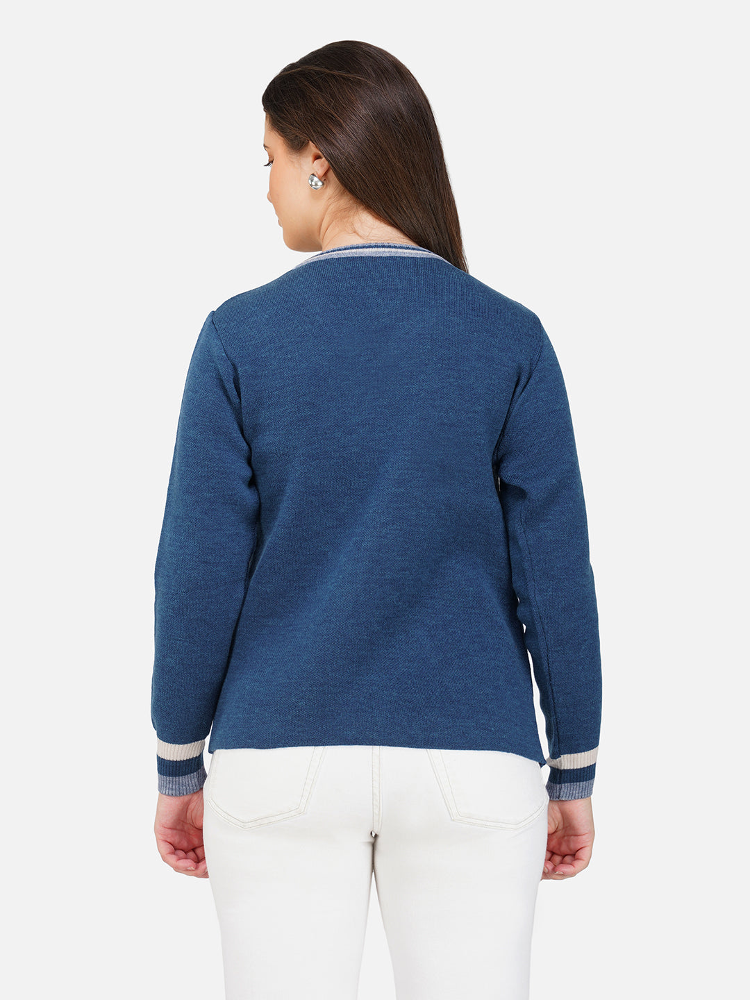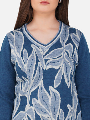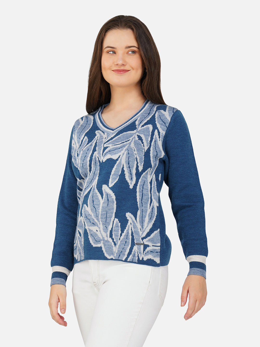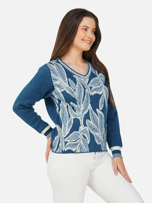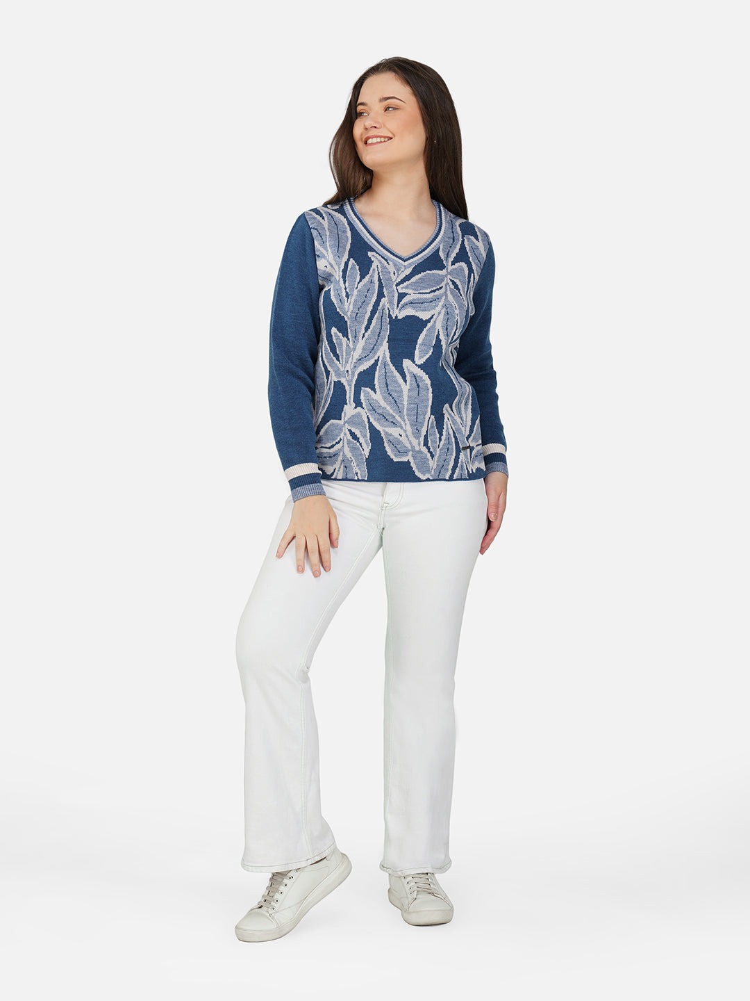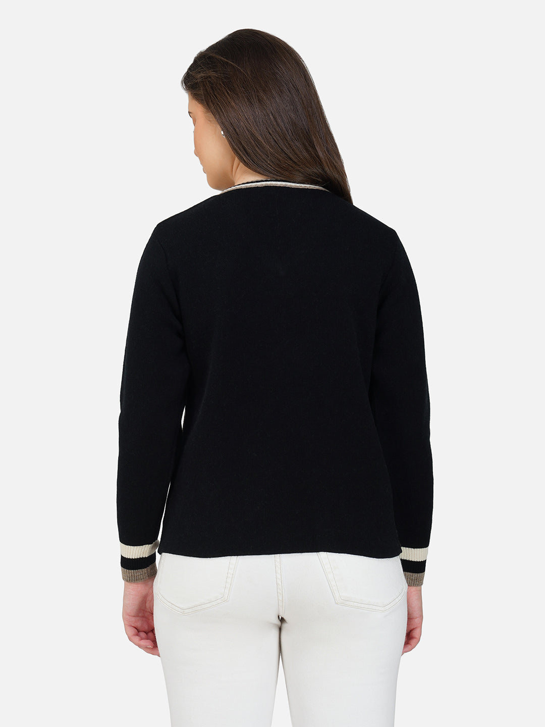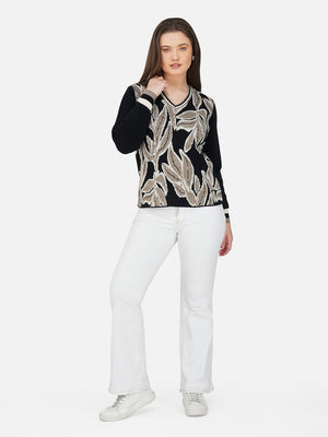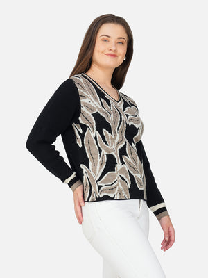 Elevate your winter wardrobe with this statement Black pullover featuring a charming vintage foliage jacquard pattern. Designed with a flattering V-neckline, it’s accented with trichromatic cuffs and neckline, adding a pop of contrast and a modern twist to its timeless appeal. Crafted for both comfort and style, this pullover effortlessly blends retro elegance with contemporary flair – perfect for cozy days and chic outings alike.