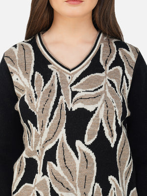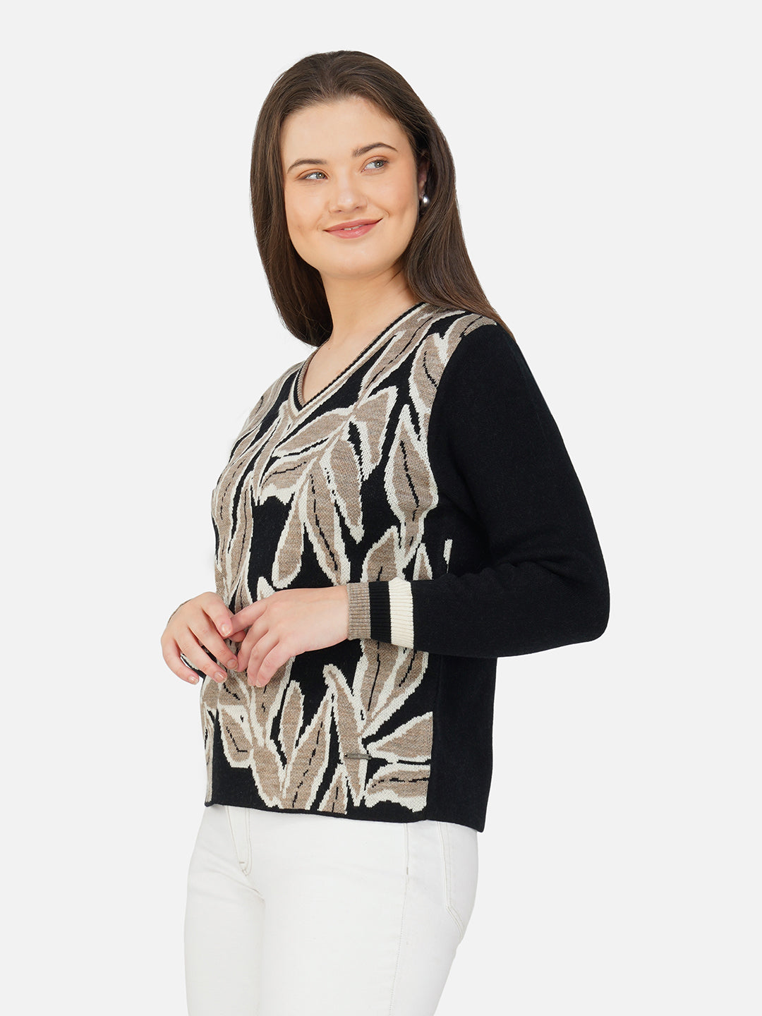 Elevate your winter wardrobe with this statement Black pullover featuring a charming vintage foliage jacquard pattern. Designed with a flattering V-neckline, it’s accented with trichromatic cuffs and neckline, adding a pop...